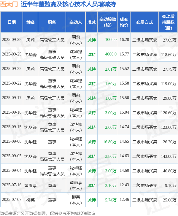 西大门:9月25日高管沈华锋、周莉减持股份合计5000股