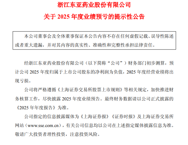 1月14日,东亚药业(605177.SH)发布于2025年度业绩预亏的提示性公告。内容中提到,经公司财务部门初步测算,预计公司2025年度归属于上市公司股东的净利润为负值,2025年度经营业绩将出现亏损。
