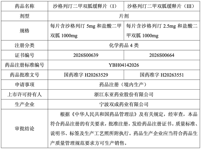 3月16日,东亚药业(605177)发布公告,近日公司收到国家药品监督管理局核准签发的沙格列汀二甲双胍缓释片(I)、(III)的《药品注册证书》。该药品适用于正在接受沙格列汀和二甲双胍治疗的2型糖尿病成人患者,以改善血糖控制。具体信息如下: