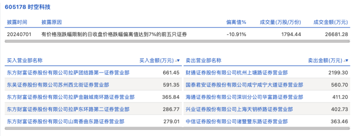 7月1日,时空科技今日跌停,龙虎榜数据显示,上榜营业部席位全天成交6121.8万元,占当日总成交金额比例为22.94%。其中,买入金额为2184.42万元,卖出金额为3937.38万元,合计净卖出1752.96万元。
