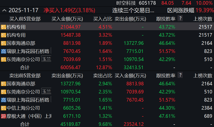 Wind龙虎榜数据显示,11月13日至11月17日期间,上榜营业部席位合计净买入1.49亿元。具体来看,机构合计净买入3.65亿元。此外,国泰海通证券总部、瑞银证券上海花园石桥路证券营业部分别买入8813.98万元、7670.45万元;国泰海通证券总部、东莞证券南京分公司分别卖出1.37亿元、1.10亿元。