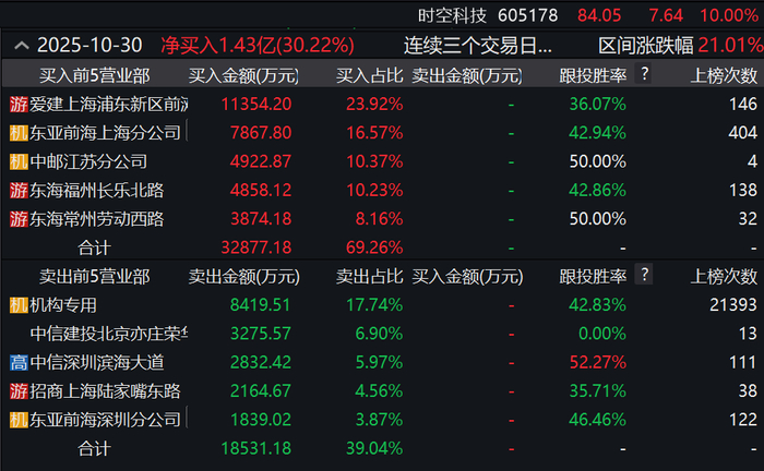其中,10月30日Wind龙虎榜数据显示,上榜营业部席位合计净买入1.43亿元。具体来看,机构合计净卖出8419.51万元。此外,爱建证券上海浦东新区前滩大道证券营业部再度买入约1.14亿元。