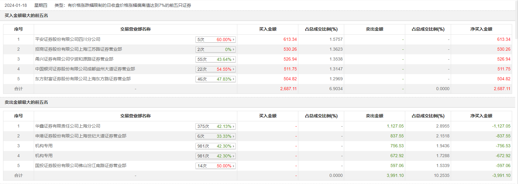 1月18日,华生科技今日涨停,全天换手率达47.96%,振幅达7.18%。龙虎榜数据显示,营业部席位合计净卖出1304.0万元。其中,机构合计净卖出1429.44万元。此外,平安证券四川分公司、招商证券上海江苏路证券营业部分别买入613.34万元、530.26万元;华鑫证券上海分公司、申港证券上海世纪大道证券营业部分别卖出1127.05万元、837.55万元。
