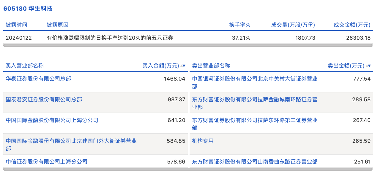 1月22日,华生科技今日跌8.03%,全天换手率达37.21%,振幅达7.11%。龙虎榜数据显示,营业部席位合计净买入2408.41万元。其中,机构合计净卖出265.59万元。此外,中国银河证券北京中关村大街证券营业部、东方财富证券拉萨金融城南环路证券营业部分别卖出777.54万元、289.58万元;华泰证券总部、国泰君安证券总部分别买入1468.04万元、987.37万元。