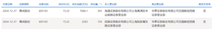 12月27日大宗交易成交655万股,成交额9969.1万元,占当日总成交额的69.23%,成交价15.22元,较市场收盘价17.17元折价11.36%。