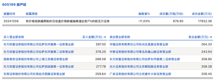12月6日,葫芦娃今日跌停,龙虎榜数据显示,上榜营业部席位全天成交2732.75万元,占当日总成交金额比例为15.24%。其中,买入金额为1601.26万元,卖出金额为1131.5万元,合计净买入469.76万元。