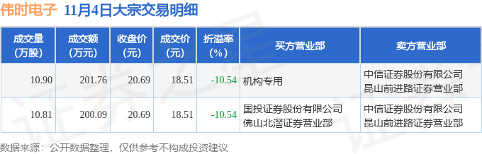 11月4日伟时电子现2笔折价10.54%的大宗交易 合计成交401.85万元