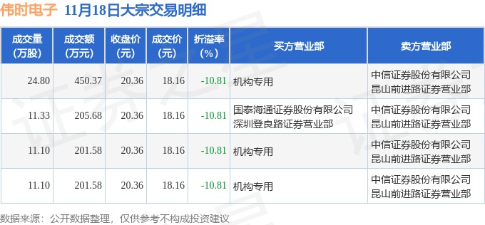 11月18日伟时电子现4笔折价10.81%的大宗交易 合计成交1059.21万元