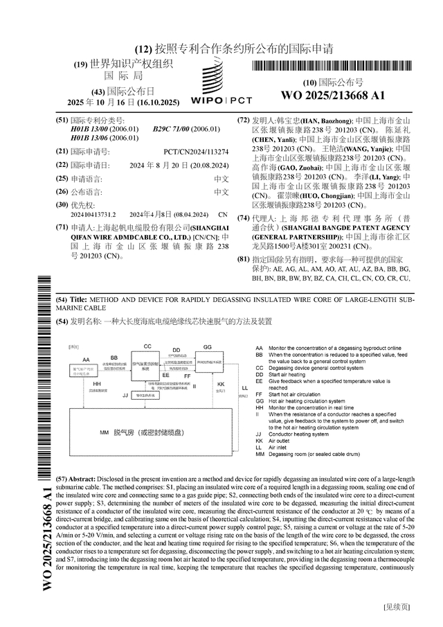 起帆电缆公布国际专利申请:“一种大长度海底电缆绝缘线芯快速脱气的方法及装置”