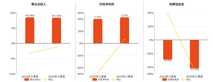 公司营业总收入为161.56亿元,较去年同报告期营业总收入减少2.09亿元,同比较去年同期下降1.28%。归母净利润为2.23亿元。经营活动现金净流入为-11.78亿元,在已披露的同业公司中排名第84,较去年同报告期经营活动现金净流入减少3.62亿元。