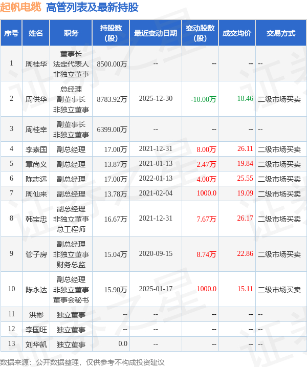 起帆电缆的高管列表及最新持股情况如下: