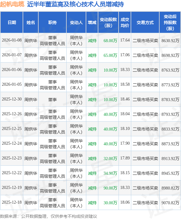 起帆电缆近半年内的董监高及核心技术人员增减持详情如下: