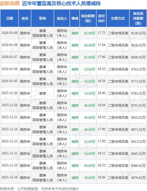 起帆电缆近半年内的董监高及核心技术人员增减持详情如下: