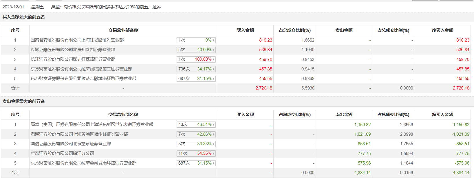神通科技12月1日跌9.93%,全天换手率达37.15%,振幅达5.96%。龙虎榜数据显示,营业部席位合计净卖出1663.95万元。其中,高盛(中国)证券上海浦东新区世纪大道证券营业部、海通证券上海黄浦区福州路证券营业部分别卖出1150.82万元、1021.09万元;国泰君安证券上海江场路证券营业部、长城证券北京知春路证券营业部分别买入810.23万元、536.84万元。