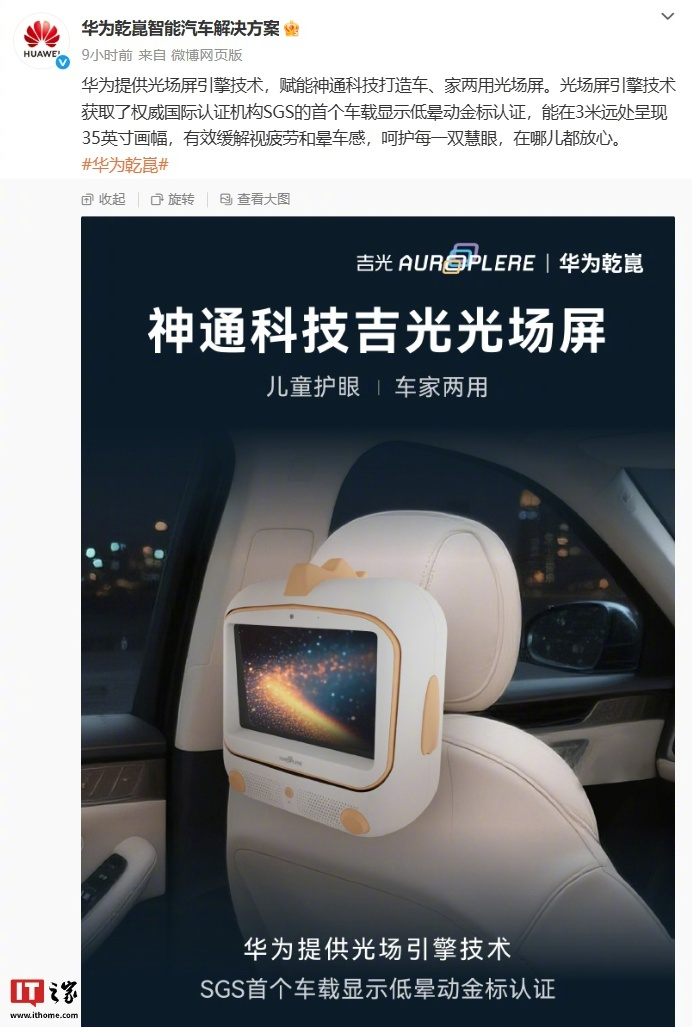 【吉光光场屏上市发布会定档 10 月 10 日:华为提供引擎技术,支持 3 米距离呈现 35 英寸画幅】华为智能汽车解决方案 BU 官方微博今日发文称,华为提供光场屏引擎技术,赋能神通科技打造车、家两用光场屏。据介绍,光场屏引擎技术获取了权威国际认证机构 SGS 的首个车载显示低晕动金标认证,能在 3……