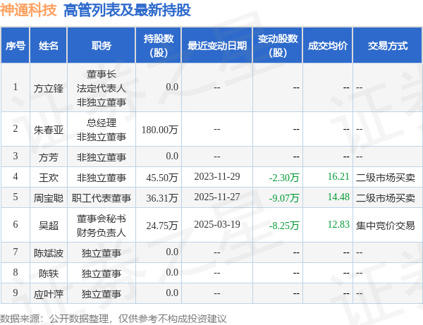 神通科技近半年内的董监高及核心技术人员增减持详情如下: