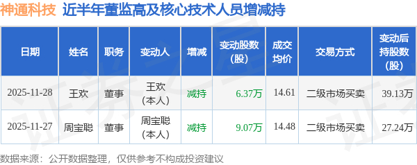 神通科技:11月28日高管王欢减持股份合计6.37万股
