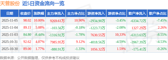 11月5日的资金流向数据方面,主力资金净流入9269.61万元,占总成交额10.9%,游资资金净流出2934.9万元,占总成交额3.45%,散户资金净流出6334.72万元,占总成交额7.45%。