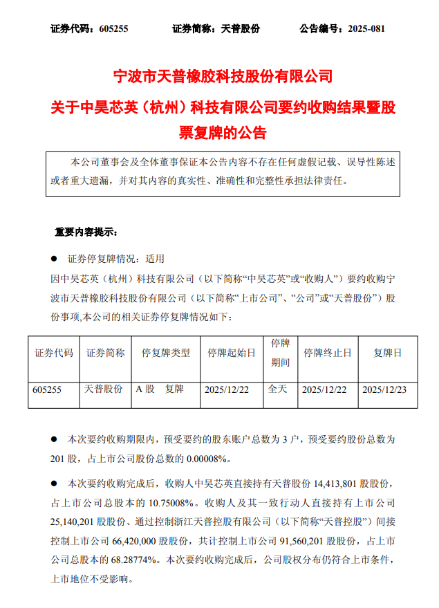 12月22日,天普股份(605255.SH)发布公告称,中昊芯英(杭州)科技有限公司要约收购期限届满,预受要约的股东账户总数为3户,预受要约股份总数为201股,占上市公司股份总数的0.00008%。收购完成后,收购人中昊芯英直接持有天普股份1441.38万股股份,占总股本的10.75008%。收购人及其一致行动人直接持有公司2514.02万股股份、通过控制浙江天普控股有限公司(简称“天普控股”)间接控制公司6642万股股份,共计控制上市公司9156.02万股股份,占公司总股本的68.28774%。公司股权分布仍符合上市条件,上市地位不受影响。公司股票自2025年12月23日起复牌。