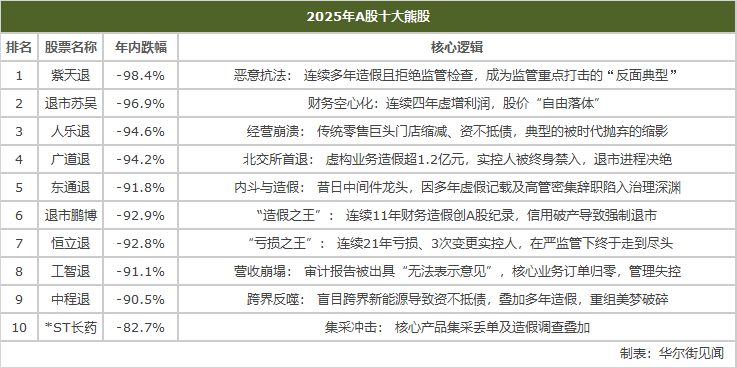 与牛股形成鲜明对比的是,2025年跌幅居前的个股大多与退市风险及经营恶化直接相关。