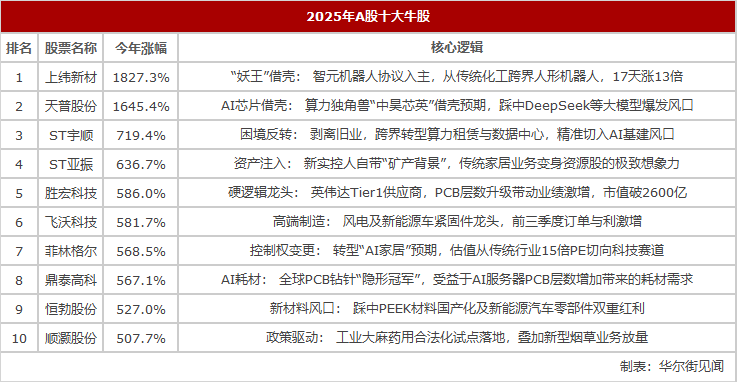 2025年被称为“并购年”与“AI算力爆发年”,涨幅榜顶端的个股几乎全部被打上了这两个标签。