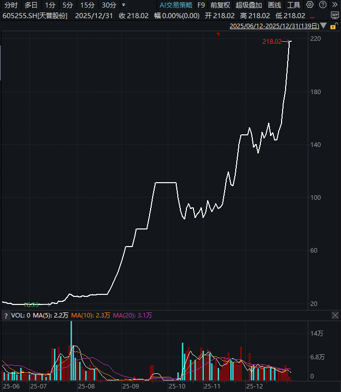 主营汽车零部件的天普股份,2025年股价实现16倍暴涨,从10元涨到218元的高位,核心是AI芯片借壳预期与TPU题材的双重发酵,引发资本合力追捧。