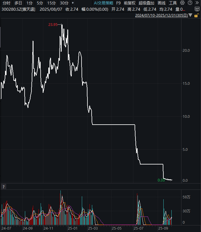 2025年4月被证监会立案调查后,股价开启持续阴跌;6月交易所出具退市预告知书,复牌后遭遇12个连续跌停;7月进入退市整理期,15个交易日内股价从9.5元跌至0.33元,跌幅超96%。