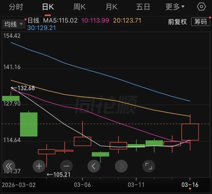 具体看,2026年3月9日,公司股价下跌6.01%;3月10日,公司股价上涨4.63%;3月11日,公司股价下跌1.58%;3月12日、3月13日,公司股价分别上涨0.50%、1.32%;3月16日,公司股价上涨5.64%,日内振幅达11.43%。