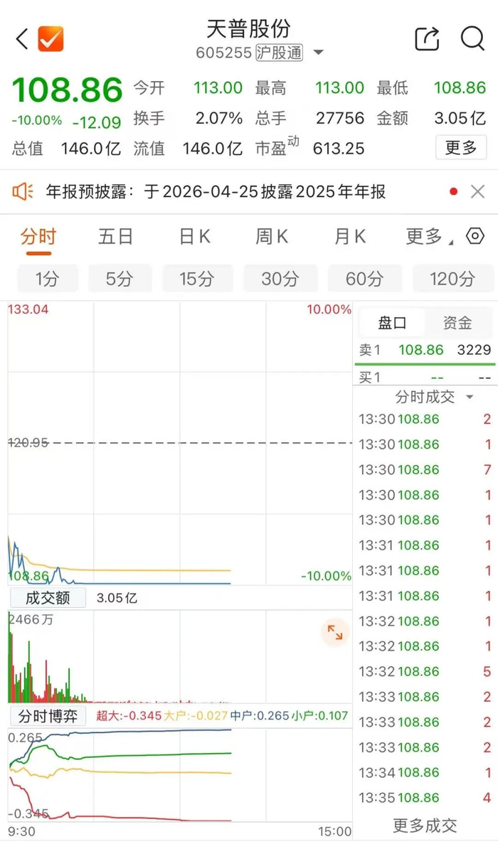 今日开盘后,天普股份跌停。