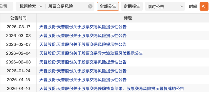 此后,公司股票价格自2025年8月22日至2026年3月16日累计上涨354.02%,并在此期间12次触及股票交易异常波动,2次触及股票交易严重异常波动情形。公司已累计发布31次异常波动、严重异常波动、交易风险提示公告,提示股票交易风险。这一数据背后,天普股份对重要信息的披露屡屡“滞后”,且在多次停牌核查中“挤牙膏”式逐步披露。