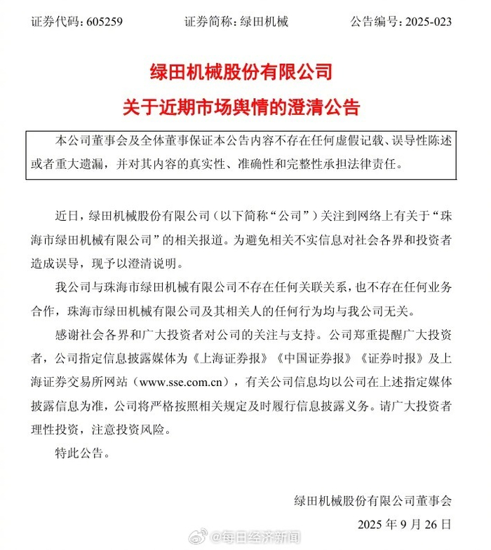 绿田机械澄清与珠海绿田无关联,称不实信息或误导投资者