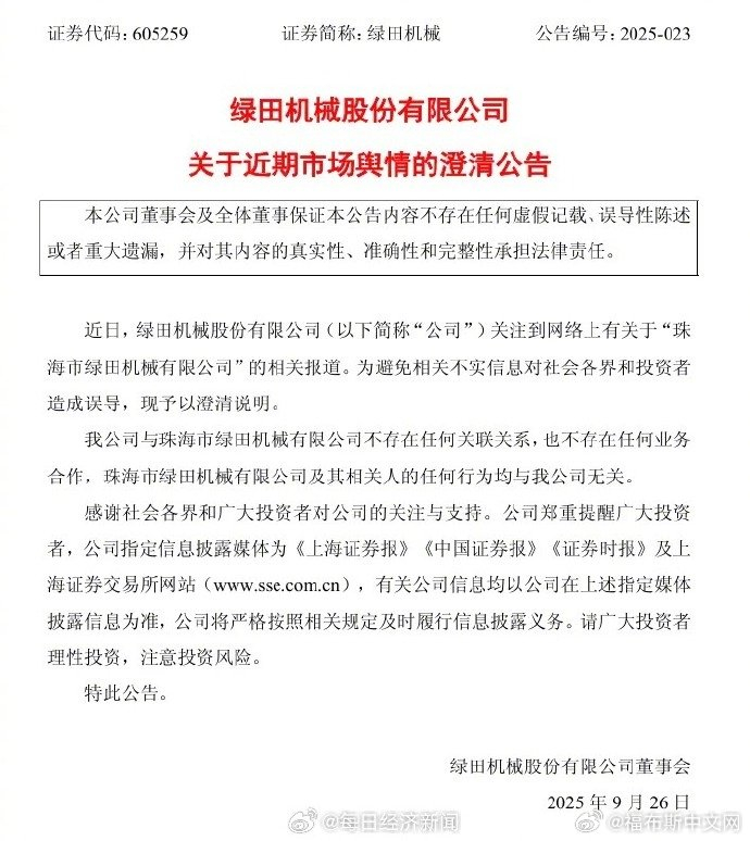 【#上市公司绿田机械发澄清公告#】9月25日晚间,绿田机械(605259.SH)发布关于近期市场舆情的澄清公告。公告称,近日,公司关注到网络上有关于“珠海市绿田机械有限公司”的相关报道。为避免相关不实信息对社会各界和投资者造成误导,现予以澄清说明。