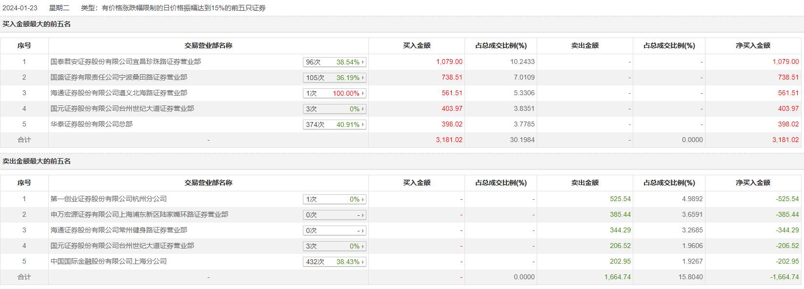 1月23日,王力安防今日涨停,龙虎榜数据显示,上榜营业部席位全天成交4845.76万元,占当日总成交金额比例为46%。其中,买入金额为3181.02万元,卖出金额为1664.74万元,合计净买入1516.27万元。