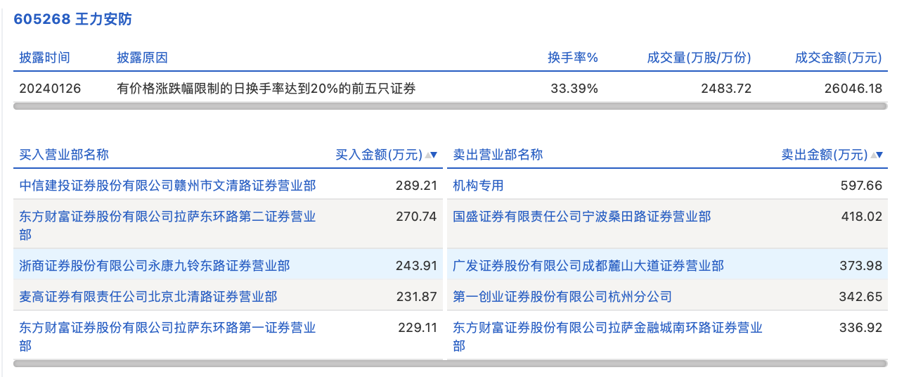 1月26日,王力安防今日跌7.07%,龙虎榜数据显示,上榜营业部席位全天成交3334.08万元,占当日总成交金额比例为12.8%。其中,买入金额为1264.85万元,卖出金额为2069.23万元,合计净卖出804.39万元。