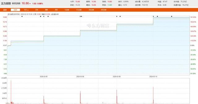 从冷门家居股到短线资金的宠儿,王力安防成为市场风口的急先锋。3 月 11 日早盘,录得连续涨停的王力安防(605268.SH)迎来股价回调,截至上午休盘,该股较开盘下跌 5.1%。而在上一交易日,该股刚以大额封单一字锁死涨停,拿下第 5 个连续涨停板,当日日内换手率不足 1%,近五个交易日累计涨幅超 60%,成为家居用品板块与短线情绪市场的核心领涨标的。