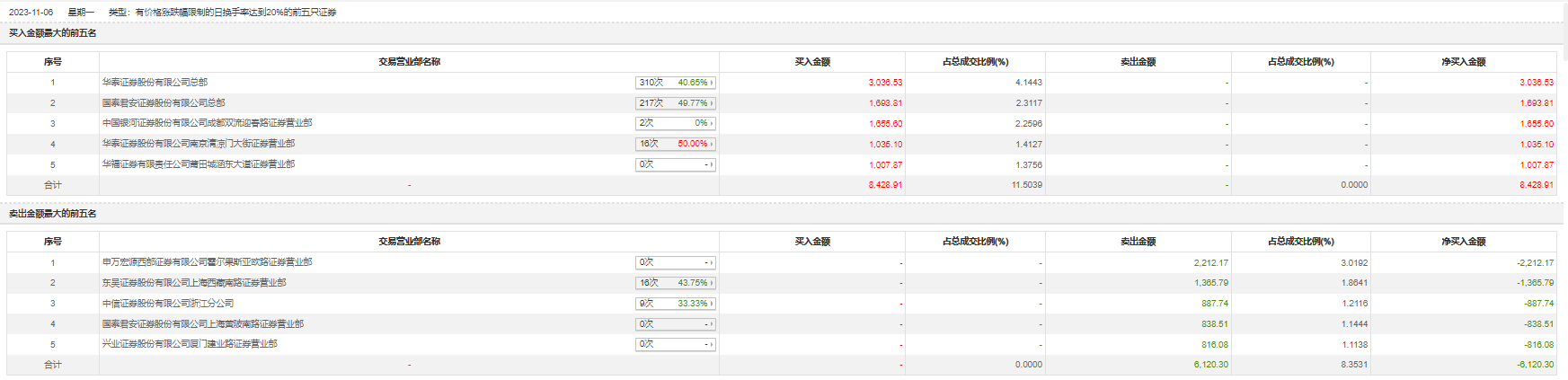 11月6日,新亚电子今日涨停,全天换手率达40.9%,振幅达10.34%。龙虎榜数据显示,营业部席位合计净买入2308.61万元。其中,华泰证券总部、国泰君安证券总部分别买入3036.53万元、1693.81万元;申万宏源西部证券有限公司霍尔果斯亚欧路证券营业部、东吴证券上海西藏南路证券营业部分别卖出2212.17万元、1365.79万元。