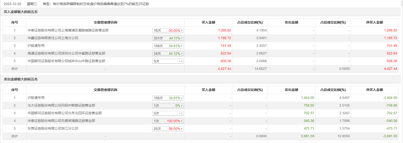 12月20日,同力日升今日涨停,全天换手率达23.1%,振幅达10.64%。龙虎榜数据显示,营业部席位合计净买入545.85万元。其中,华泰证券上海黄浦区黄陂南路证券营业部、华鑫证券上海分公司分别买入1266.82万元、1189.72万元;沪股通专用、光大证券丹阳中新路证券营业部分别卖出1404.00万元、758.95万元。