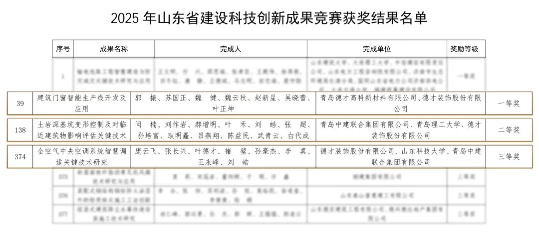 近日,德才股份及旗下子公司在两项省级权威评选中荣获四项荣誉:在山东省住房和城乡建设厅2025年建设科技创新成果竞赛中斩获一等奖、二等奖、三等奖各一项,山东土木建筑学会科学技术一等奖一项,展现强劲的创新实力。