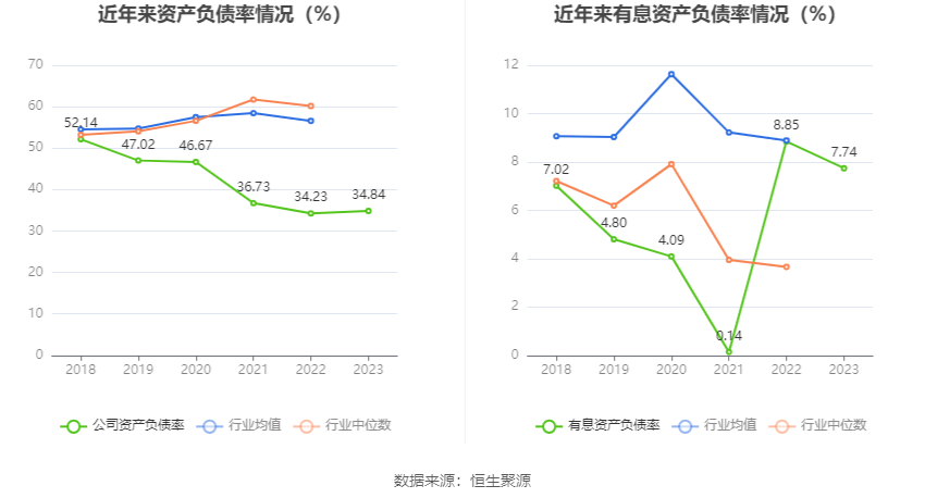 在偿债能力方面,公司2023年年末资产负债率为34.84%,相比上年末上升0.61个百分点;有息资产负债率为7.74%,相比上年末下降1.11个百分点。