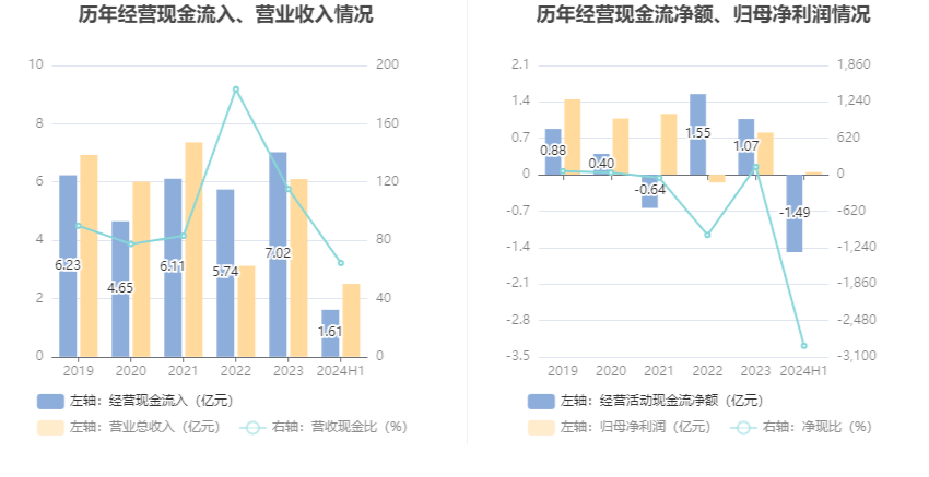 2024年上半年,公司营业收入现金比为64.37%,净现比为-2914.33%。