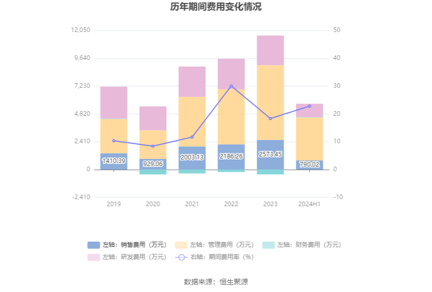 2024年上半年,公司期间费用为5706.32万元,较上年同期增加1233.49万元;期间费用率为22.82%,较上年同期上升0.69个百分点。其中,销售费用同比下降15.47%,管理费用同比增长33.55%,研发费用同比增长31.1%,财务费用由去年同期的-134.93万元变为32.61万元。