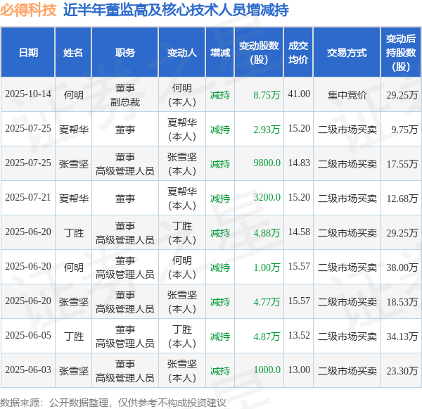 必得科技近半年内的董监高及核心技术人员增减持详情如下: