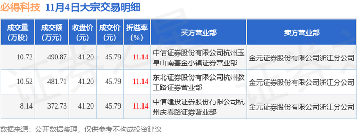 11月4日必得科技现3笔溢价11.14%的大宗交易 合计成交1345.31万元