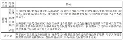 公司产品主要分为健身器材和展示架。其中,健身器材主要分为室内健身器材和室外路径产品,具体如下表所示: