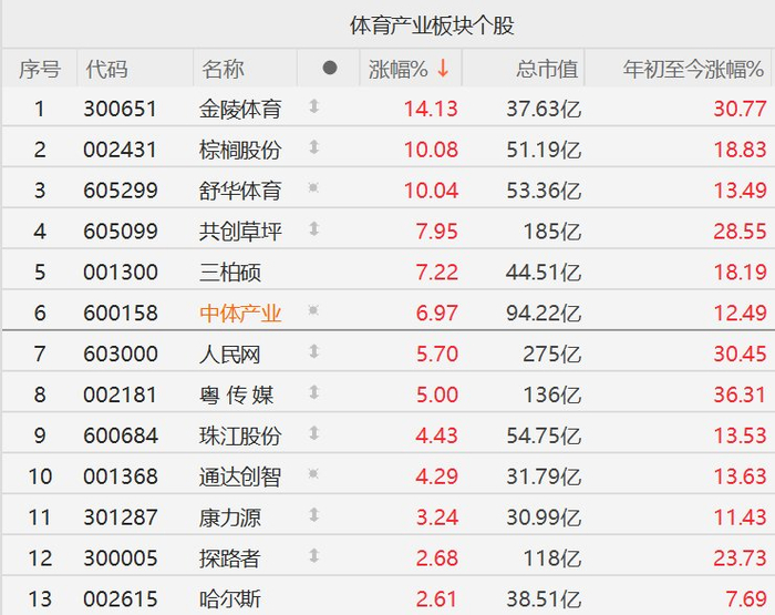 格隆汇1月21日|A股市场体育产业股走强,其中,金陵体育涨超14%,棕榈股份、舒华体育10CM涨停,共创草坪、三柏硕涨超7%,中体产业涨近7%,珠江股份、通达创智涨超4%。消息面上,U23国足3比0击败越南队,历史首次晋级亚洲杯决赛,引发市场热议。