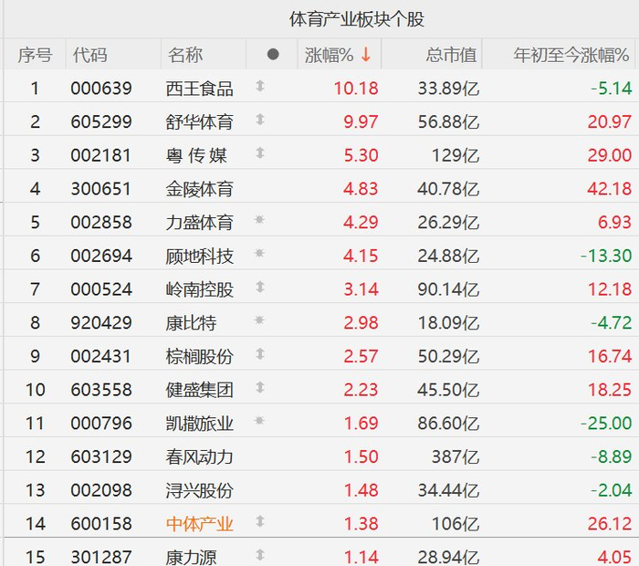 格隆汇3月16日|A股市场体育概念股逆势上涨,截至半日收盘,西王食品、舒华体育涨停,粵传媒涨超3%,金陵体育、力盛体育、顾地科技涨超4%。