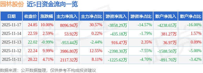 证券之星消息,园林股份11月17日涨停收盘,收盘价24.85元。该股于9点32分涨停,5次打开涨停,截止收盘封单资金为778.8万元,占其流通市值0.19%。