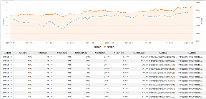 5月13日大宗交易成交183.39万股,成交额7614.31万元,占当日总成交额的21.41%,成交价41.52元,较市场收盘价46.19元折价10.11%。