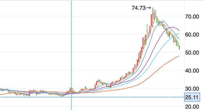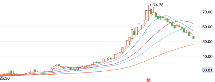 今年7月29日公告股权转让后,法狮龙股价强势上涨,从不到30元最高涨至74.73元。回调30%后,市值仍有65亿元……