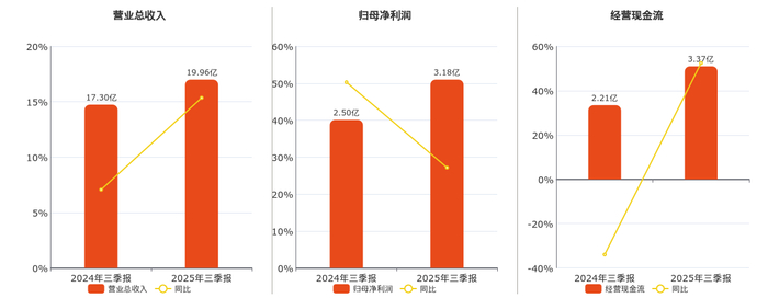 公司营业总收入为19.96亿元。归母净利润为3.18亿元。经营活动现金净流入为3.37亿元。